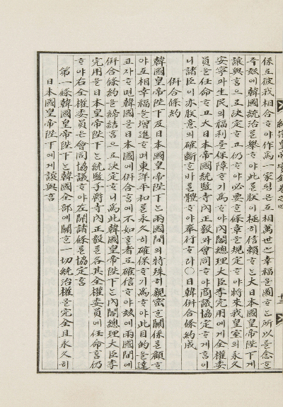 詔曰: "朕이 東洋平和 鞏固키 爲야 韓、日兩國의 親密 關係로 彼我相合야 作爲一家됨은 互相萬世之幸福을 圖 所以를 念즉, 玆에 韓國統治 擧야 此를 朕이 極히 信賴 大日本國皇帝陛下게 讓與으로 決定고, 仍야 必要 條章을 規定야 將來我皇室의 永久安寧과 生民의 福利를 保障기 爲야 內閣總理大臣李完用에게 全權委員을 任命고, 大日本帝國統監寺內正毅과 會同야 商議協定게이니, 諸臣이 亦朕意의 確斷바 體야 奉行라。"